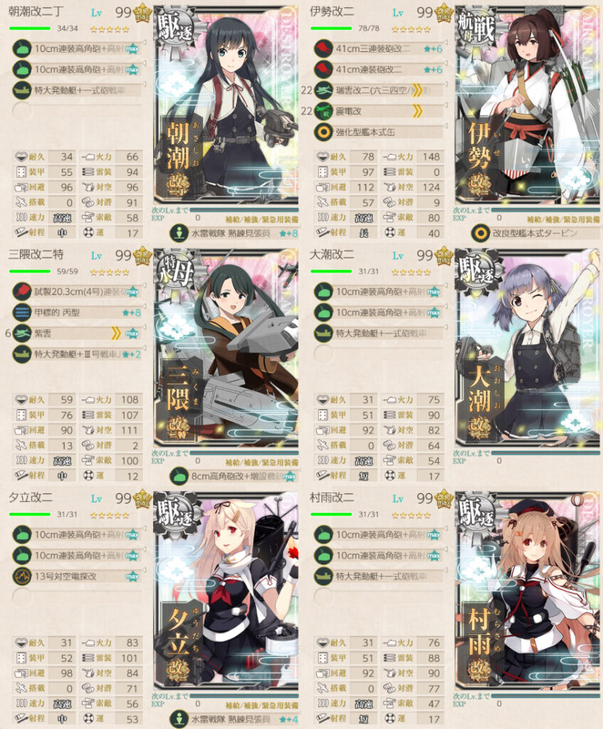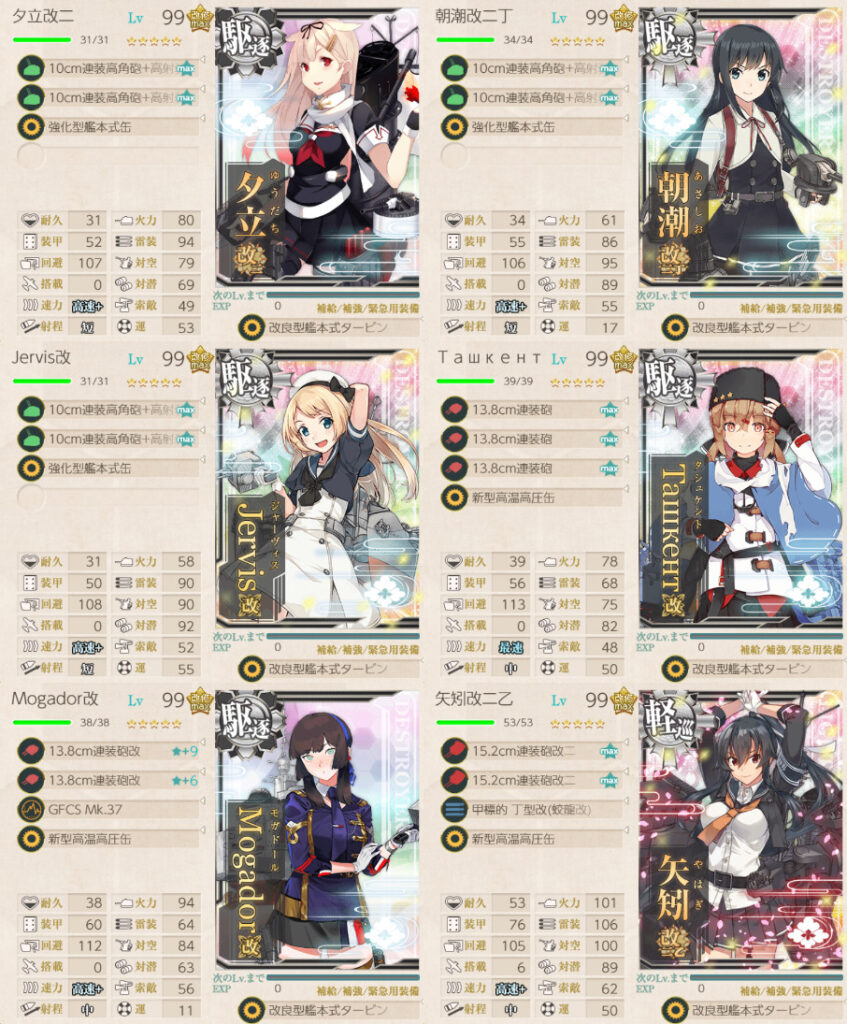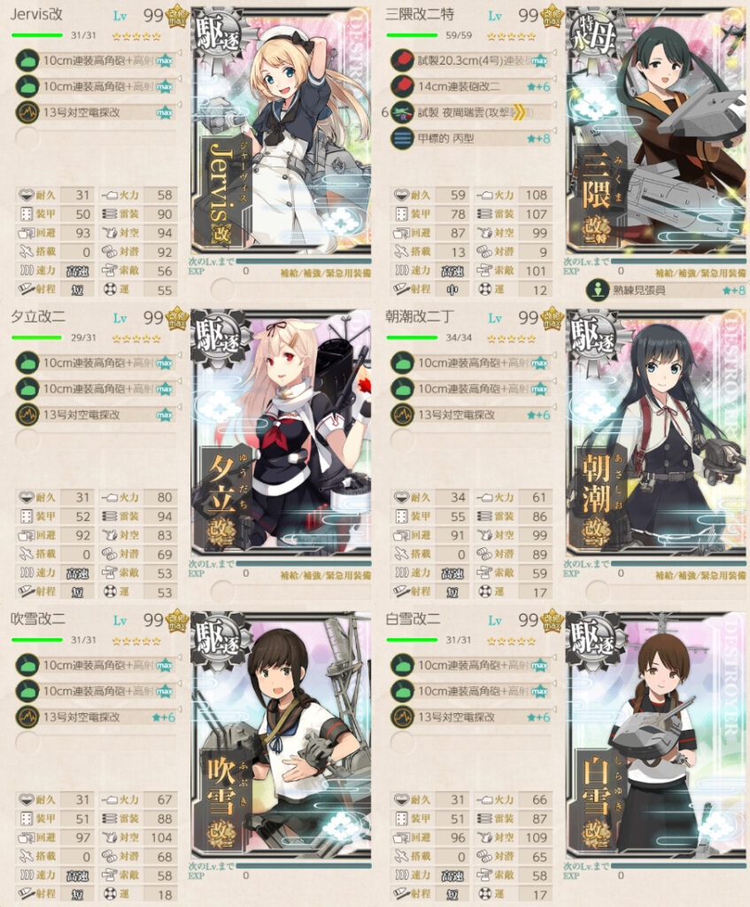 「Minneapolis」「Tuscaloosa」「Gambier Bay」「Jervis」「朧」「夕立」「村雨」「朝潮」「野分」「巻波」旗艦含む3隻以上の強襲艦隊でキス島沖、北方AL海域、中部北海域ピーコック島沖の敵を撃滅せよ!