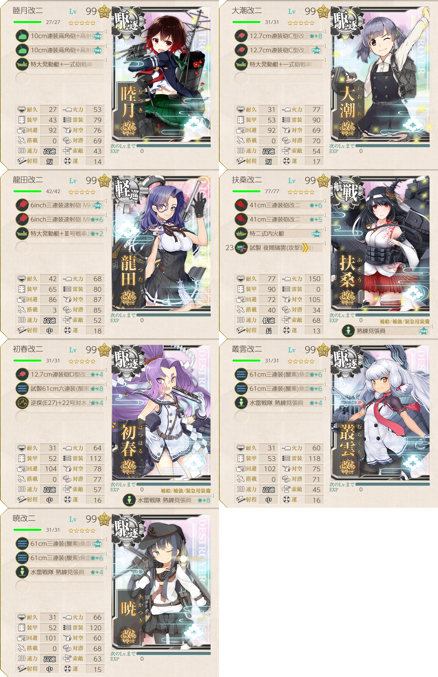 ※天霧改二を入れると、天霧とその前後の艦が夜戦で動かない不具合があるっぽいです。天霧の採用を検討されている方は要注意。直ってるっぽいです。