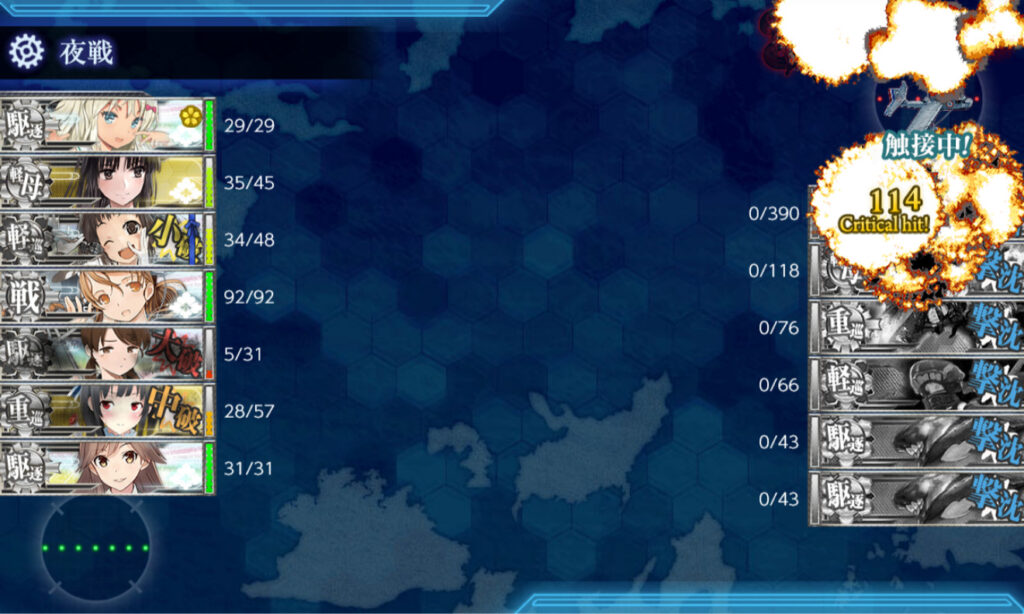 昼戦で随伴艦全滅のボス大破という最高の展開。最後は、グレカーレのカットインで余裕の勝利。