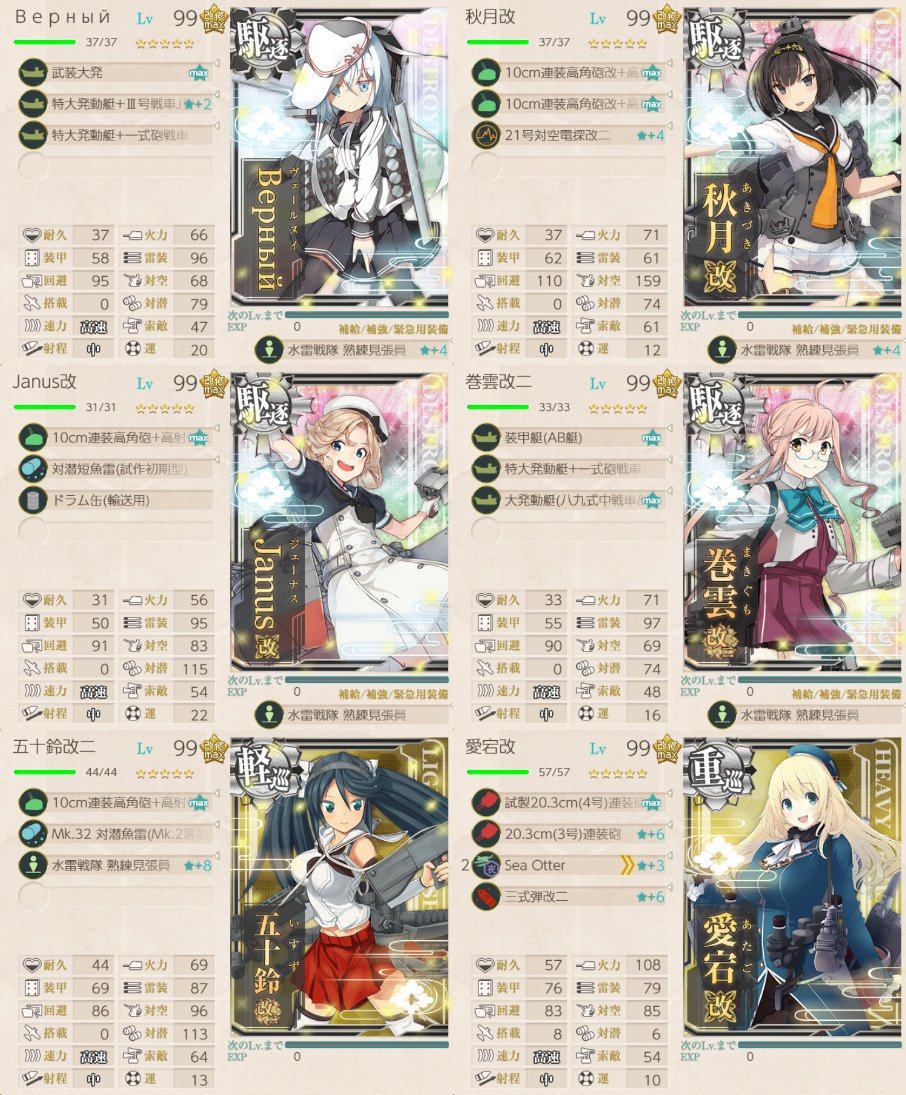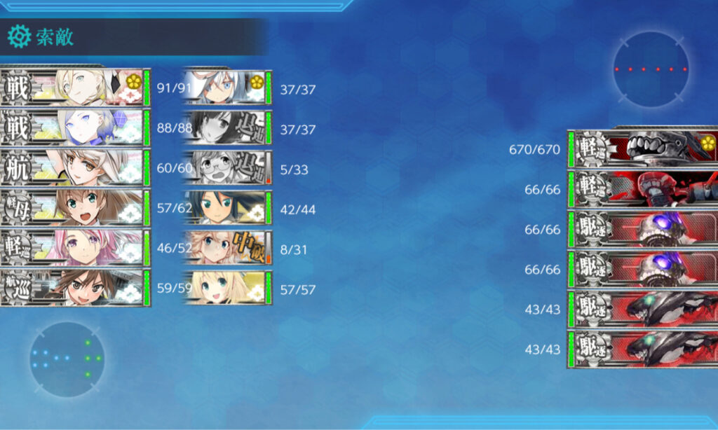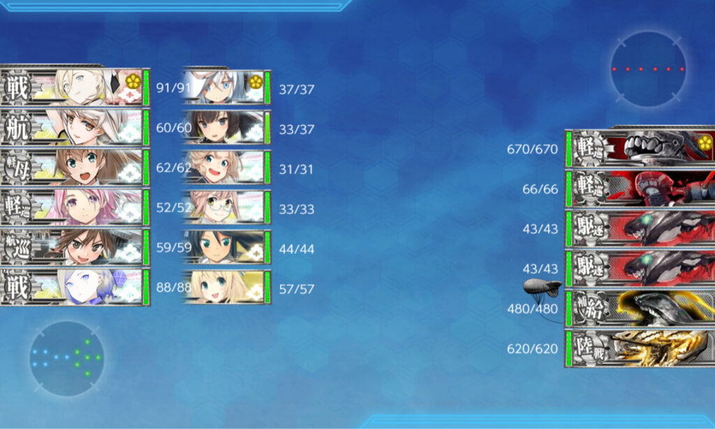 戦艦×2、正規空母×1、軽空母×1、航巡×1、軽巡×1(高速統一)。低速混じりの場合、駆逐艦が5隻以上いないと1戦増えるっぽい。航巡は水母でも可。