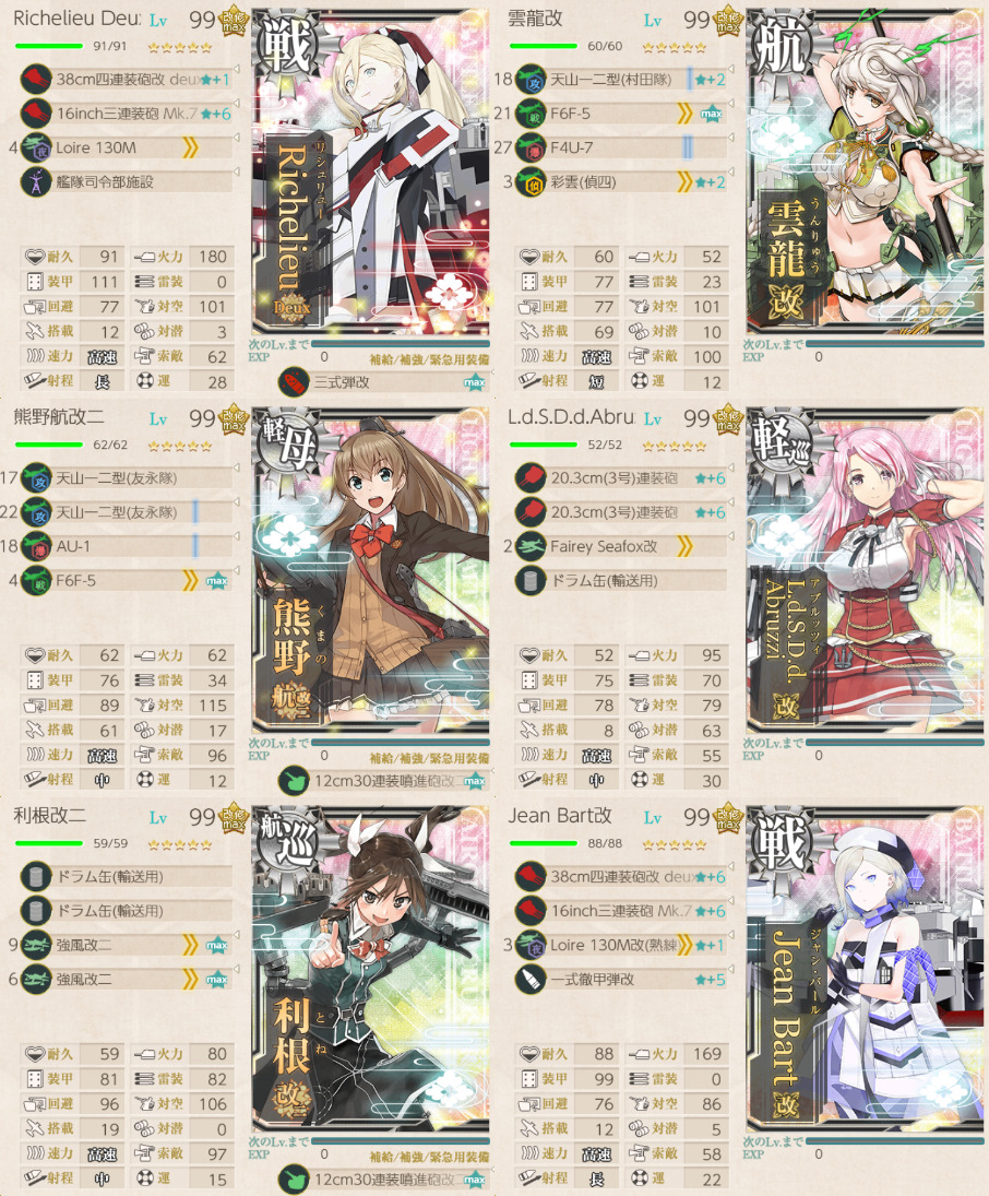 空母機動部隊で敵が通常艦隊の場合はリシュリュータッチが出ないらしいので、昼S勝利狙いでジャン・バールを1番下に置いた。