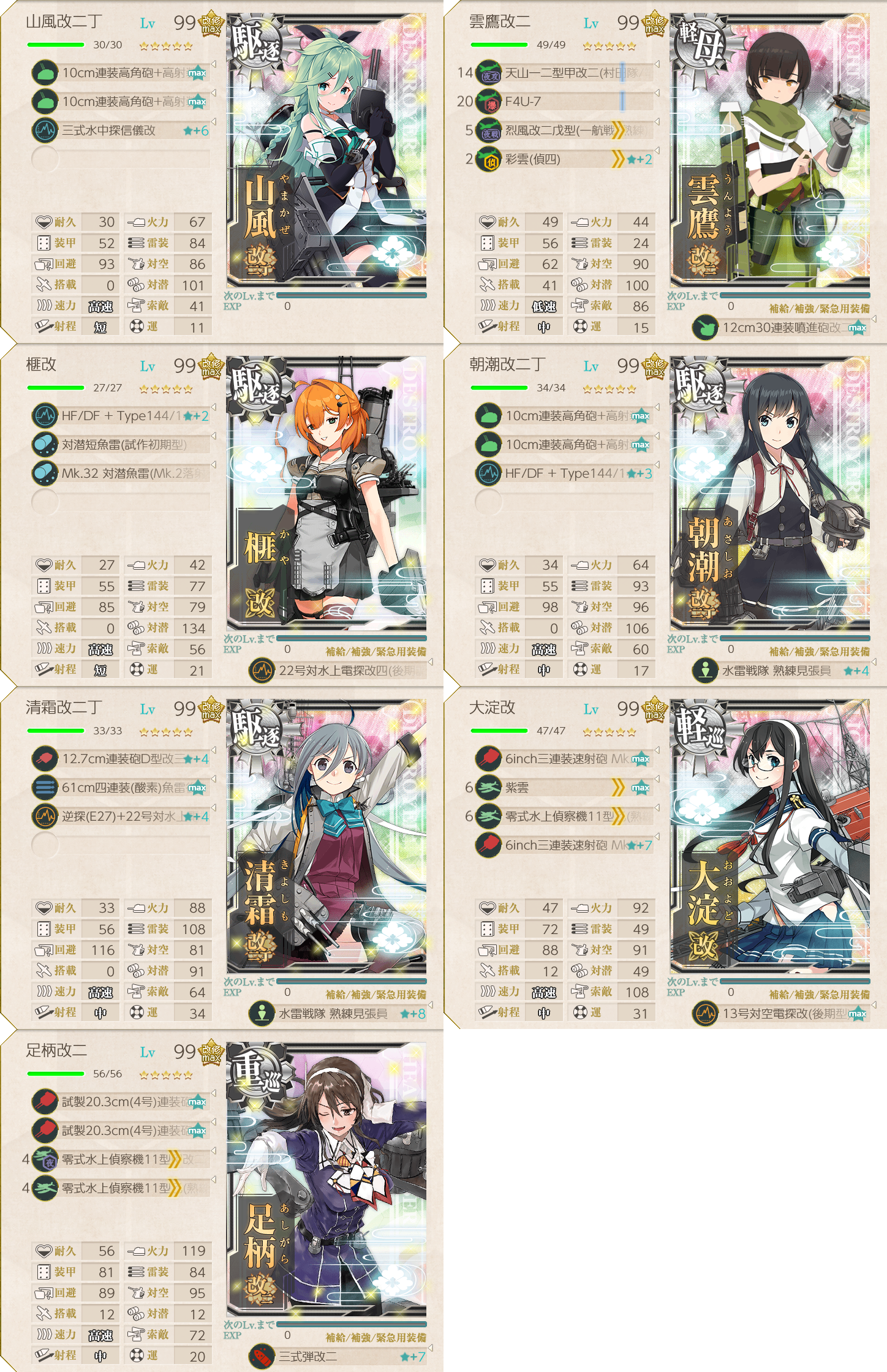特効艦は足柄、大淀、清霜、榧の4人。霞と朝霜も特効艦だが、E5で強特効があるらしいので温存。