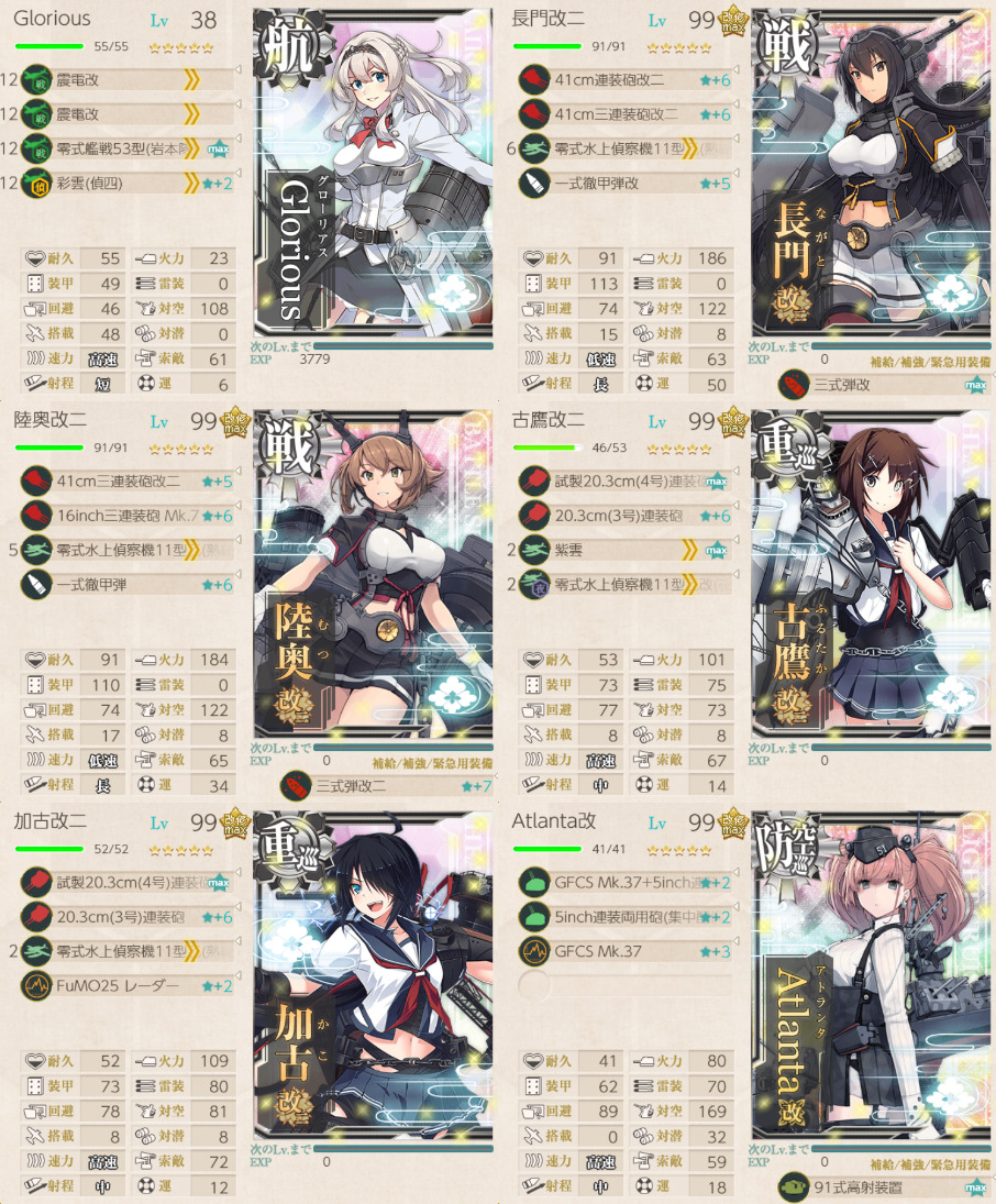 E5-3で使う予定の長門と陸奥を起用。正規空母枠は、お札温存のため前段の報酬艦であるグローリアスにした。重巡の2人は誰でも良い。アトランタはこの先出番がなさそうだったので、ここで使うことにした。