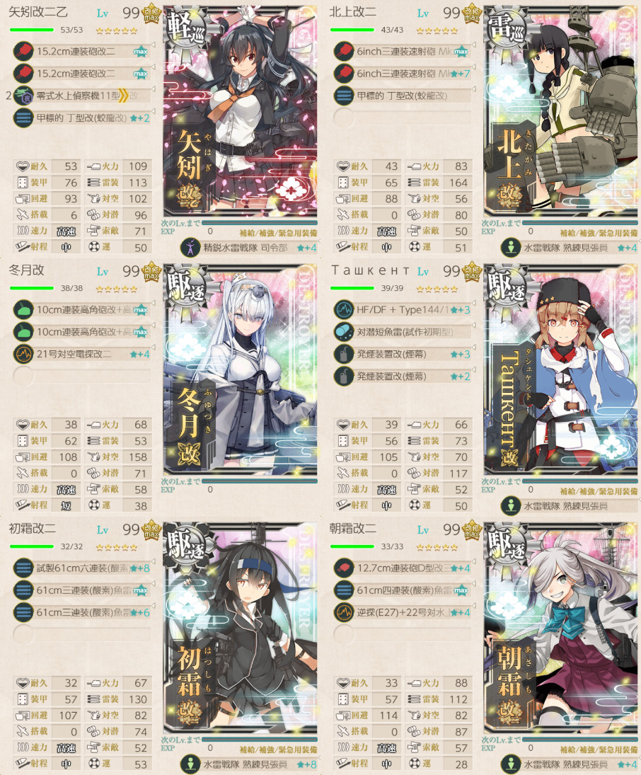 自分はE5-4で嫁艦の川内さんを使うつもりなので、ここで矢矧を入れた。矢矧のサブがいない場合は、軽巡枠を誰にするかよく考えること。