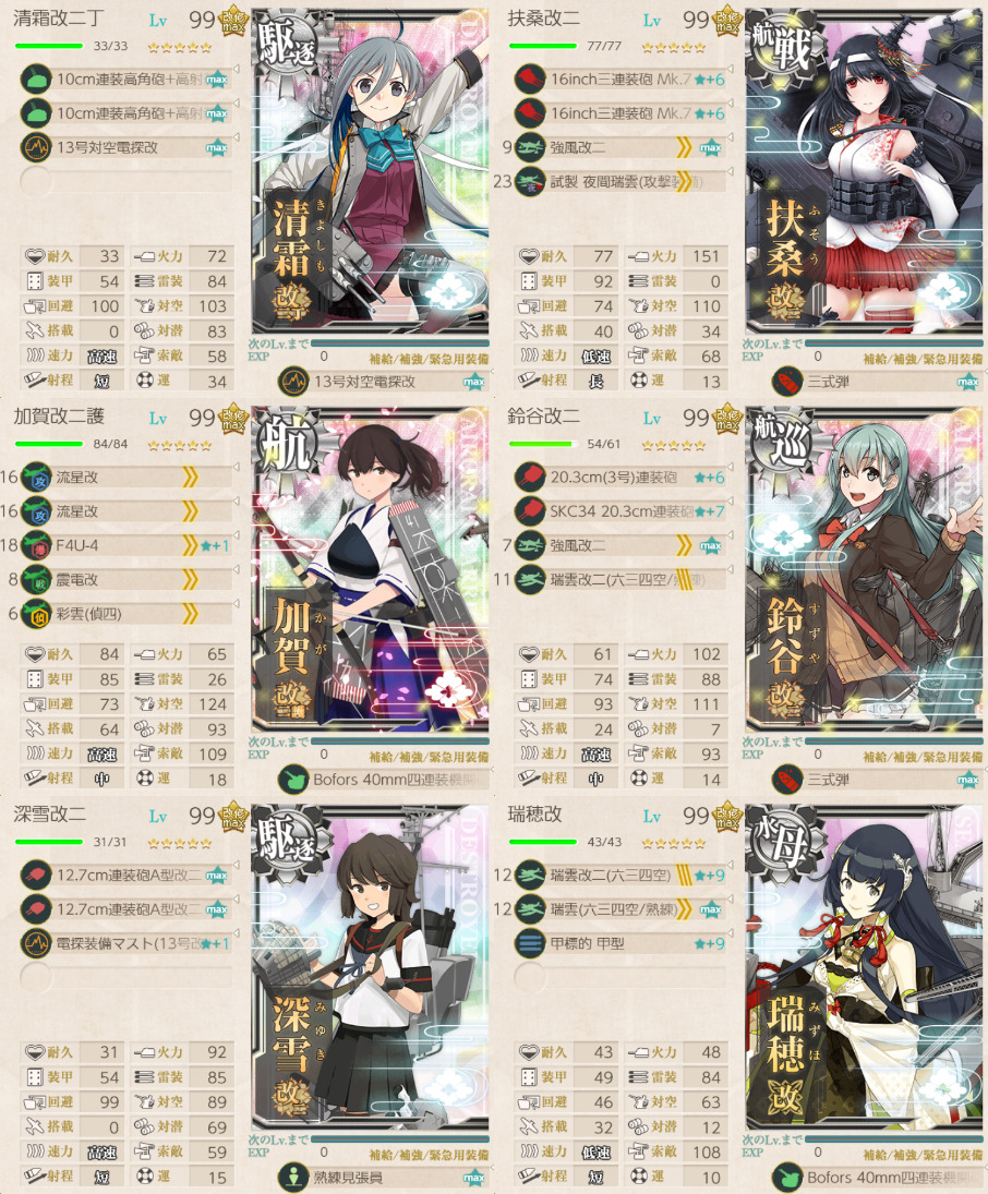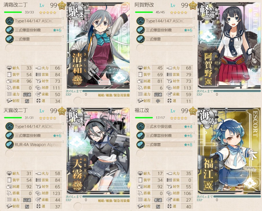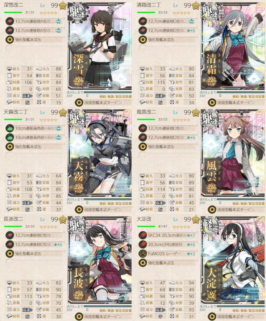 「阿賀野」「酒匂」「瑞穂」「如月」「深雪」「浦波」「天霧」「狭霧」「峯雲」「清霜」「朝霜」を旗艦と他2隻以上を含む艦隊で鎮守府近海、北方キス島沖、サブ島沖海域、MS諸島沖の敵を反復撃滅せよ!