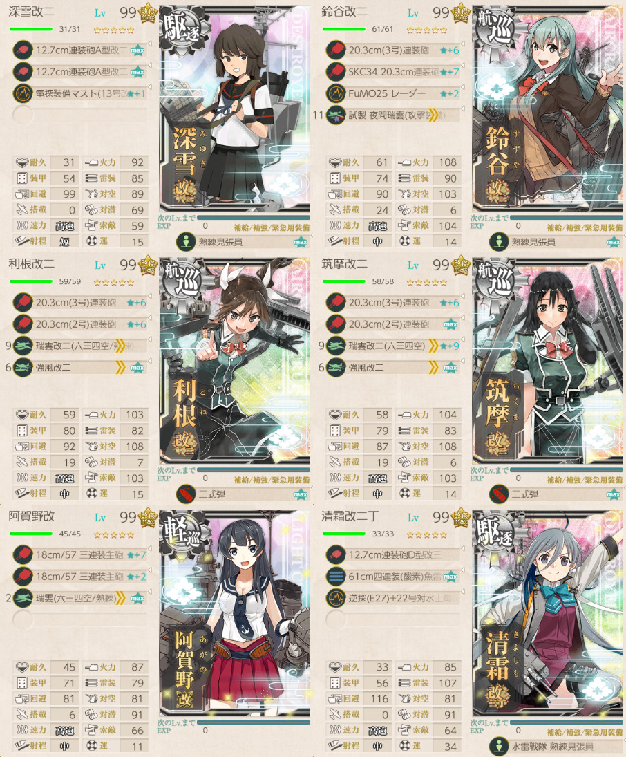 航巡×3、軽巡×1、駆逐艦×2の編成。阿賀野の瑞雲は枯れるので注意。