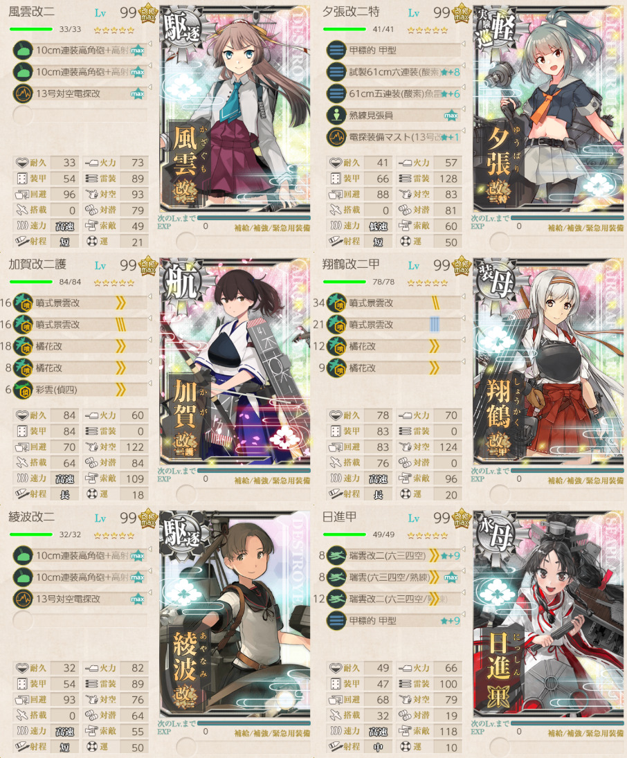 空母×2、軽巡×1、水母×1、駆逐艦×2の編成。2-3はランダムで逸れる。