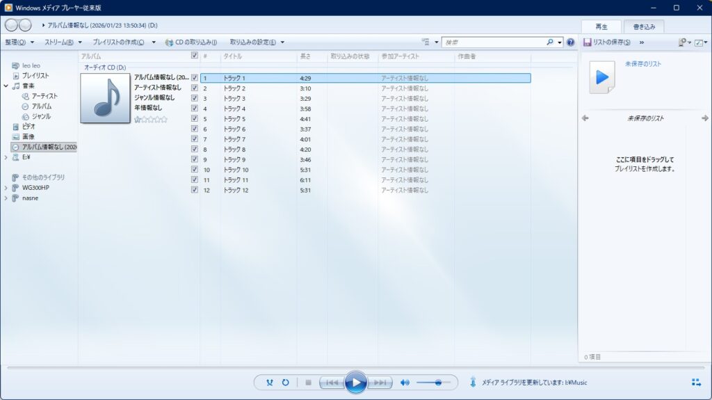 で、CDをドライブに入れると自動的に楽曲情報を取得してくれる。