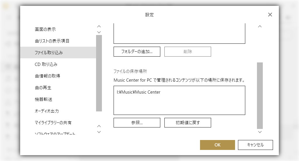 あとは、ファイルの保存場所も要チェック。デフォルトだとミュージックフォルダ内に「Music Center」っていうフォルダが作られてその中に保存されるので、それが嫌な人は保存場所を変更しよう。