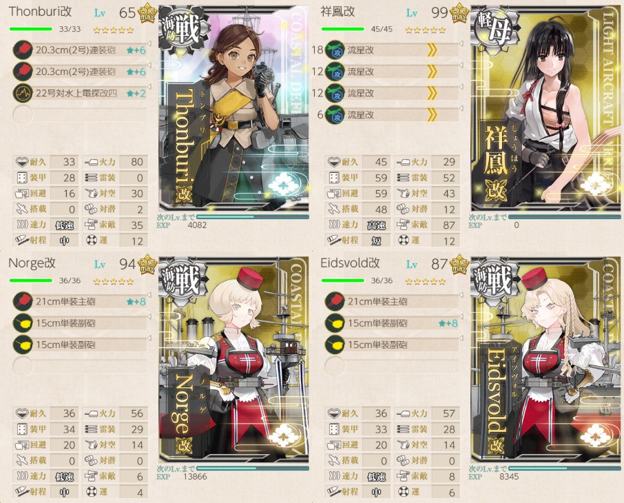 軽空母×1、海防戦艦×3の編成。ボスに行けなくて疲労が溜まることがあるので、最後にやることをおすすめ。