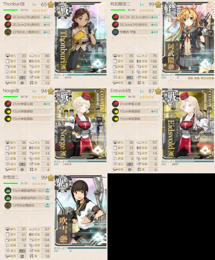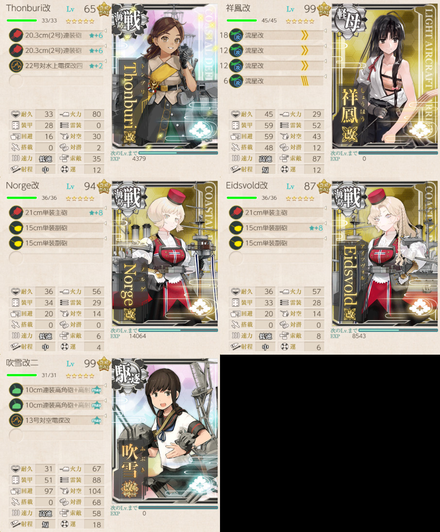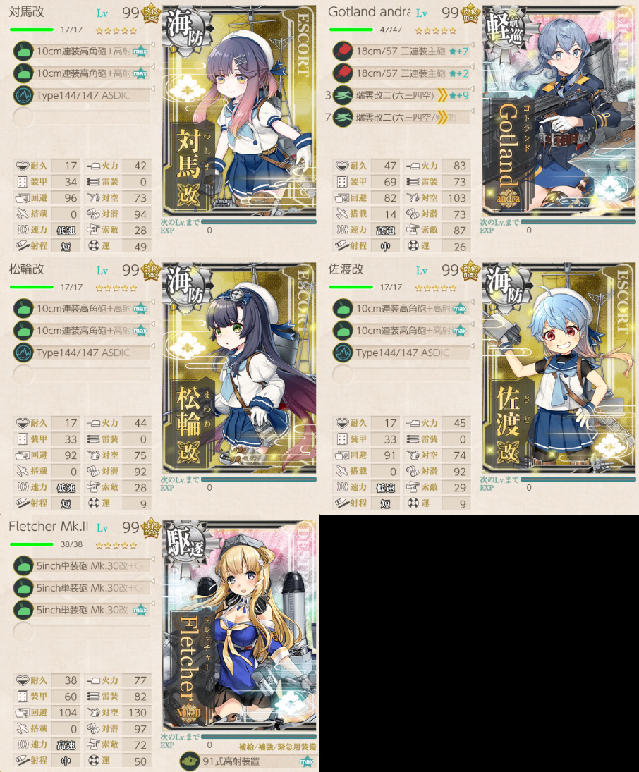 軽巡×1、駆逐艦×1、海防艦×3の編成。航空戦マスで敗北を回避するために、ゴトランドに瑞雲を積んでいる。ランダムでGマスから北に行っちゃうが、その場合はお祈り。