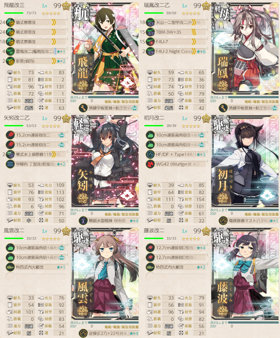 北方棲姫マスでS勝利取りたい場合は、瑞鳳の艦爆を艦攻にするとか矢矧に内火艇積むとかした方が良いかも。