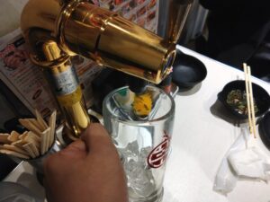 全テーブルにハイボールタワーが設置されており、自分で注ぐスタイルになっている。レバーを手前に引くとハイボール、奥に押すと炭酸が出てくる。