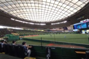 席は一塁側ブルペンの近く。
